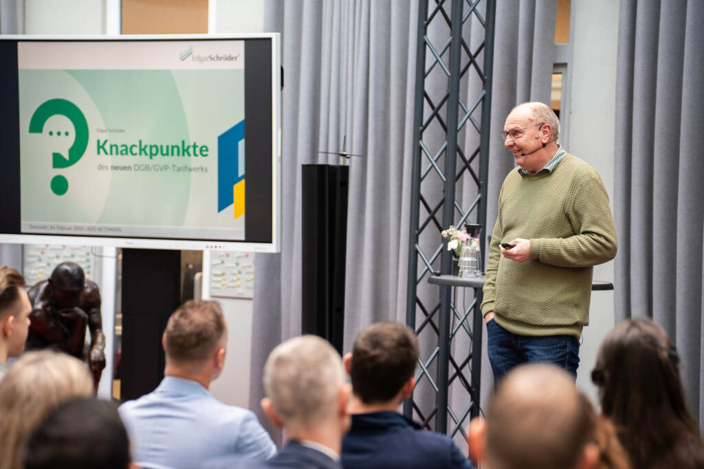 Tarifrecht muss keine trockene Materie sein – das zeigte uns auf seine gewohnt offene und heitere Weise Edgar Schröder mit seinen Branchennews. Als erster Redner des Fachforums nahm er uns mit zu den Knackpunkten des neuen DGB/GVP-Tarifwerks. Es ging um Historie und Haltung. „Warum machen wir Tarifverträge? Weil sie Struktur schaffen. Sicherheit geben. Orientierung bieten.“