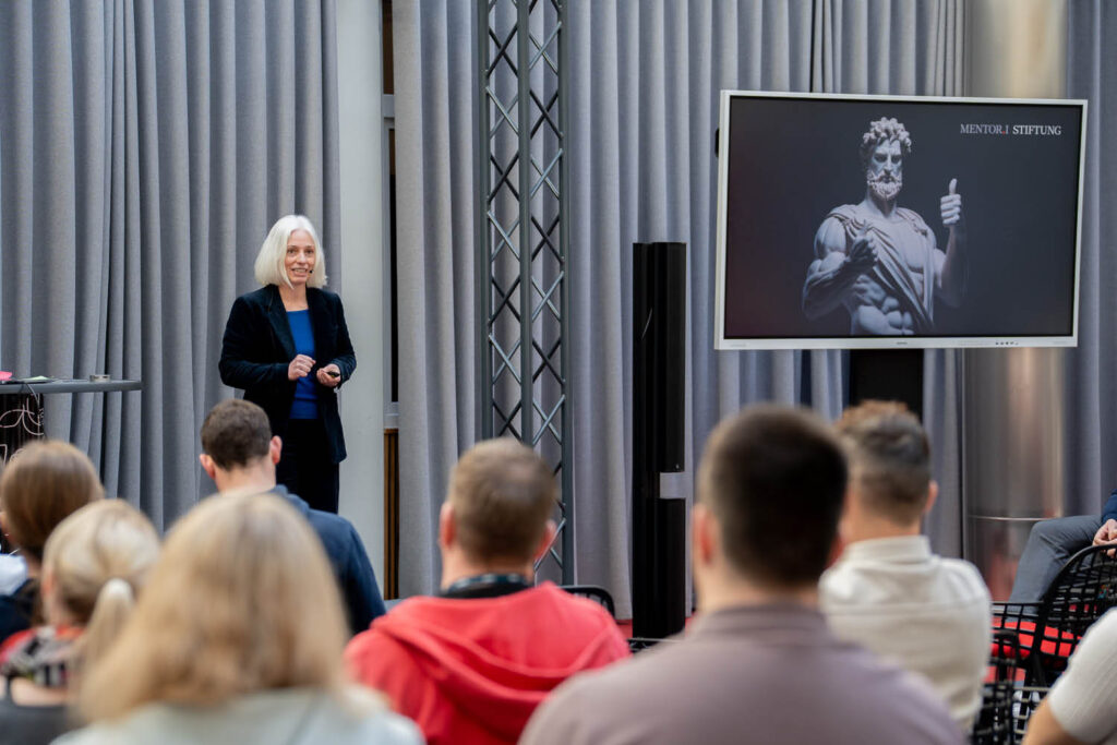 Zum Abschluss des Fachforums 2026 brachte Bettina Nolting die MENTOR.I Stiftung auf die Bühne. Die seit 2016 tätige gemeinnützige Stiftung agiert durch die Kultur als Brückenbauer zwischen Wirtschaft und Wissenschaft, indem sie unter anderem philosophische Fragen in ökonomische Kontexte stellt. Augenzwinkernd und mit gewohnt bewegendem Subtext stellte sie die Themen und Zielgruppen der Stiftung vor, die sich regional sowie bundesweit in unterschiedlichen Formaten bewegen. Sie nahm die Bedeutung der Gemeinnützigkeit für das gesamte NETZWERK deutlich in den Fokus: Verantwortung ende nicht am Unternehmenstor und gemeinsam könne man Großes bewegen. Der gleichzeitige Mehrwertfaktor wurde am Beispiel von Kundenveranstaltungen in die Runde getragen.